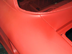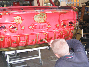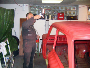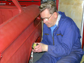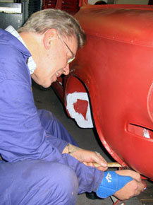 Der Lackierer tut sein Werk. Es werden Schicht für Schicht Spachtelmasse aufgetragen und wieder herunter geschliffen. Rundungen geformt und Übergänge angelegt. Viel Spachtelmasse wird verarbeitet, aber fast genau so viel wird auch wieder heruntergeschliffen. Es braucht seine Zeit.