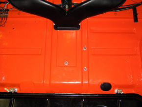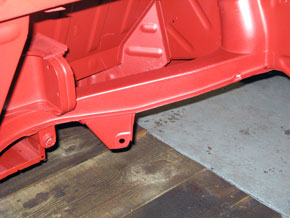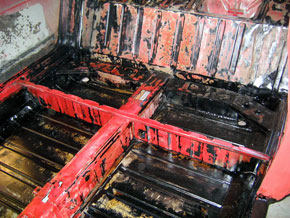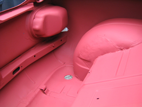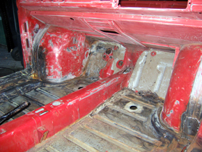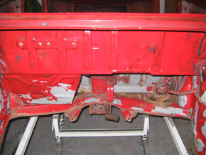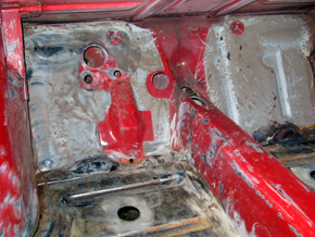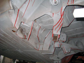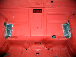 Kofferraumwanne, Frontblech unten, Stoßdämpferaufnahme innen, Achstunnelenden - hier wurden Bleche ein- und aufgesetzt. Stabiaufnahme in Ordnung.