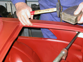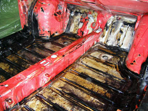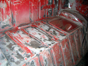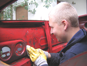 Jedes Teil an der Karosse wird mechanisch komplett vom Rost befreit und dann zusätzlich noch mit FERTAN behandelt. Übergänge von Arbeitsabschnitten werden stellenweise einige Zentimeter in bereits aufbereitete Blechbereiche hinein erneut verschliffen, um auch wirklich eine saubere Aufarbeitung zu erlangen.