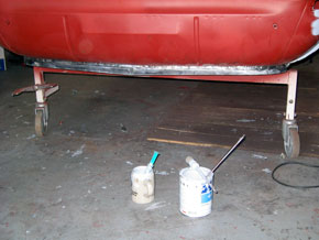 Viel Schleifmittel, Sandstrahlgerätschaft, Schweißgerät, Druckluft, etc., etc., Bierchen und Verbandskasten mit Pflaster. ... und reichlich Grundierung zum Korrosionsschutz und den wie immer von Spiess Hecker.