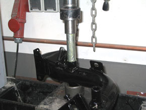 Wenn schon, dann gleich richtig - auch wenn es viel Arbeit ist. Die Gummimetalllager waren zwar noch nicht hin, aber wer baut schon die Achse wieder aus, wenn sie am richtigen Platz sitzt. Also, Augen zu und durch. WD40 kam als Gleitmittel und zur Lösung von Anrostungen zum Einsatz. Zunächst wurden die Lager mittels einer Hydraulikpresse heraus gedrückt. Dabei bedarf es schon einiges an "Spezialwerkzeug". Hohlkörper für unten, in das das alte Lager frei gedrückt werden kann. Passstück für oben, mit dem das Lager exakt an der Innenwandung herausgedrückt werden kann. Da kommt einem schon mal eine große Nuß ganz gelegen. Auf jeden Fall klappte alles sehr gut und es war immer ein schönes Geräusch, wenn sich das alte Lager mit einem lauten Krach löste. Eingepresst wurden alle in entgegengesetzter Richtung. Der Innenkörper und das Lager wurden mit Fett eingestrichen und alles kam an seinen Platz. Nach drei Stunden war denn alles fertig und die "14" Gummimetalllager von vorne und hinten waren eingepreßt. Trotz Anmahnungen einiger Experten, man solle die Teile hinterher lacken, waren kaum Lackbeschädigungen aufgetreten.