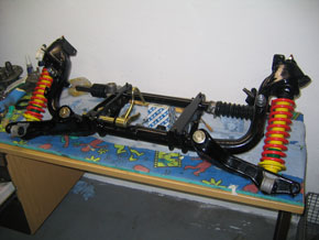 Tja, und in der Zwischenzeit haben wir dann auch die Achsteile aufbereitet. Sie wurden gestrahlt, grundiert und schwarz gelackt. Alle Gummimetalllager werden noch getauscht.
