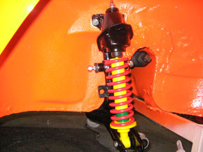 Die rechte Achseinheit wird verbaut. Die lose Schräglenkeraufnahme am Fahrzeugboden ist noch nicht fest verschraubt, da wir noch Spiel zum Einbau benötigen. Die beiden ersten Schrauben werden durch die Gummimetalllager geschoben. Der Dämpfer wird oben verschraubt und dann die Feder mit dem Gummilager oben gesteckt. Geht alle etwas stramm und ist eine saubere Geschichte. NSU hat mit Freigabe angegeben, dass die Federn zweieinhalb Wicklungen gekürzt werden können. Bei meinem grünen TT hatte ich das auch gemacht.
