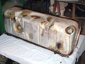 Timo hat in der Sandstrahlkabine getobt und die Remotec - Alufelgen 5 1/2x13 mit altem Sand gestrahlt. Warum alter Sand? Alter Sand ist wie Pulver und greift die Metalloberfläche nicht so stark an wie neuer Sand. Der Stabi wurde auch gestrahlt und schon einmal grundiert. Vier Tanks hatten wir zur Auswahl und ich hoffe, dass wir die richtige Wahl getroffen haben. Hier etwas Rost, dort etwas Rost. Wir nahmen den Besten und beseitigten Farbrückstände mit Abbeizer aus dem Baumarkt. Nachdem er farbfrei war, wurde er mit Stahlwolle poliert. Zum Abschluss bekam er noch an einigen Stellen FERTAN zur Rostumwandlung.