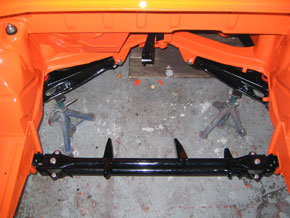 Nachdem alles verbaut ist, werden auch die Schrauben der Schräglenkeraufnahme am Fahrzeugboden fest angezogen. Die Schrauben, die durch die Gummimetalllager gehen sind noch lose, da sie erst festgezogen werden dürfen wenn das Fahrzeug fertig verbaut ist und auf eigener Achse steht. Warum?, die Lager schwingen nach oben und unten, und würden ohne Achsbelastung (Fahrzeuggewicht) zu einer Seite hin überbelastet werden. Das gilt für alle Gummimetalllager.