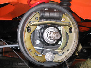 Die Radlager für vorne bekomme ich erst heute Nachmittag, darum fangen wir mit den hinteren Radlagern an. Die Lager wurden schon vor Tagen mittels eines Dornes heraus geschlagen. Ihren Lackanstrich hatten sie auch schon erhalten. Zunächst wurden die Lager, die einseitig verkapselt sind, von der offenen Seite her mit Fett gefüllt. Dann wurde das erste Lager mit dem alten Lager und einem kleinen Hammer angesetzt. Nun wurde das Innenpassstück ebenfalls mit Fett eingesetzt und das zweite Lager auch angesetzt. Mittels eines Passstückes, welches über die Bremstrommelaufnahme gestülpt wurde und den beiden alten Lagern, wurde das ganze mit dem Schraubstock verpresst. Querlenker, Bremsplatte und Lagereinheit wurden verschraubt. Man mag darüber denken wie man will, aber wir setzen alle Teile die verbaut werden, wegen Rost- und Korrosionsvorbeugung mit Hohlraumversiegelung ein. Der Gummistern ist auf seiner Außenseite plan verschraubt. Durch die hohe Belastung, der er im Fahrbetrieb ausgesetzt ist, kann er sich verdrehen und zerstört werden. Um dem vorzubeugen, haben wir seine Innenseite ebenfalls mit einer Metallplatte verschlossen. Die Bremszylinder sitzen auch schon an ihrem Platz. Rechts - links - fertig.
