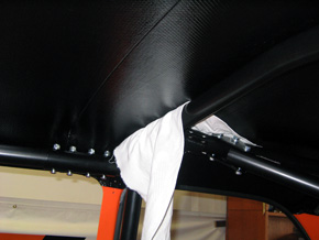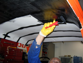 Heute war der Himmel an der Reihe. Die Zahnleisten waren neu und sollten an ihren Platz. Nur, wo waren die Löcher zum Verschrauben geblieben. Ursachenforschung. Es gab zwei Ausführungen, mit und ohne Zahnleiste. Unser NSU-Himmel hatte keine Zahnleiste und wurde geklebt. Nachdem die Querstangen in die richtigen Löcher eingehakt waren (es gibt davon je drei Löcher) und er gezogen und gezerrt war, wurden die Enden mit Pattex verklebt. Nach kurzem Ablüften des Klebers setzten wir dann unzählige Halteklammern an.
