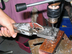 Letzte Reste von Rost, Spachtelmasse und Farbe werden aus den kleinen Stellen per Sandstrahlpistole vertrieben.