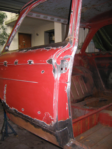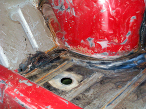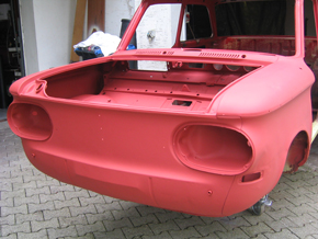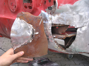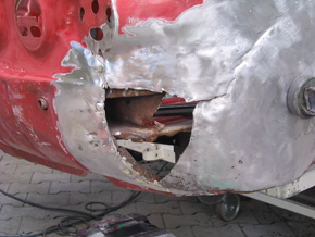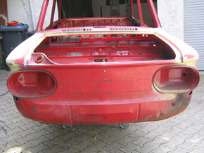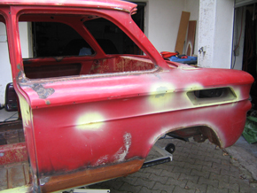 Viel Rost - Bedingt durch die angefangene Restauration und den nicht ausreichenden Oberflächenschutz. Fertigstellung von nicht beendeten Arbeiten. Beseitigung von fehlerhaften Schweißarbeiten. Reparatur des Heckschadens.