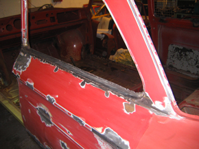 Nicht die besten Schweißarbeiten kamen zum Vorschein. In die Unterkanten der beiden hinteren Fenster waren schon einmal Bleche eingeschweißt worden. Auch unten zwischen der B-Säule und dem Radausschnitt waren neue Reparaturbleche eingeschweißt worden, mit einer Überlappung von gut drei Zentimetern. Die Türfalz unten hatte ebenfalls keine genaue Passung mehr weil auch dort Blechstücke eingesetzt worden waren. Was soll es, alles kommt neu. Hans Herrmann Walter aus Lemgo wird da schon wieder wie immer das Richtige auf Lager haben.