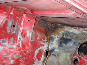 Das Heck, ölig und schmutzig war es damals hinterlassen worden. Gut, rostet nicht so schnell. Timo geht an die Arbeit. Mit einem trockenen Lappen wird der Motorraum vom Dreck befreit. Lose Farbe, und davon gibt es viel, blättert ab. Verstehen kann ich es nicht so richtig, weil, ist ja der Erstlack. Nach drei Stunden ist die Arbeit getan. Zum Vorschein kommt super gesundes Blech mit Erstgrundierung, natürlich auch Rost und so manche böse Überraschungen. Die rechte Seite ist hinten doch mehr gestaucht wie erwartet. Die Strebe am Heckblech ist verbeult. Die Kotflügelecken sind im unteren Bereich durch eine Patchwork Bratespachtelei verunstaltet, dazwischen ver- und durchgerostete Bleche. Nun gut, muss halt gemacht werden, und das ordentlich - aber später. Wochenende.