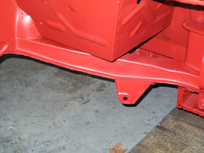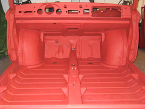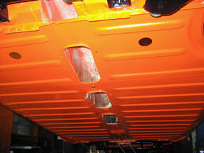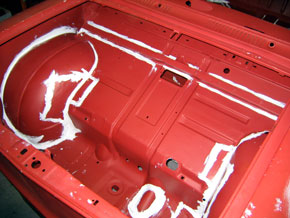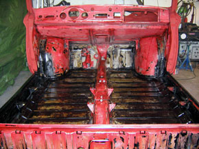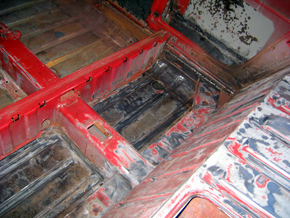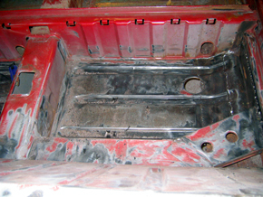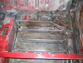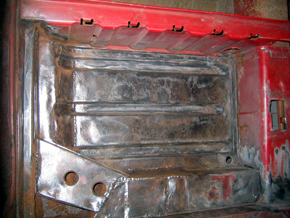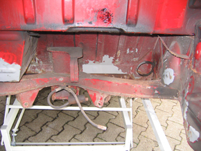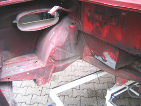 Kofferraumwanne, Frontblech unten, Stoßdämpferaufnahme innen, Achstunnelenden - hier wurden Bleche ein- und aufgesetzt. Stabiaufnahme in Ordnung.