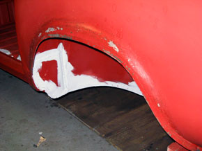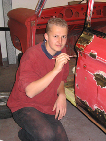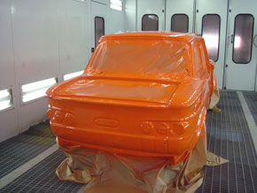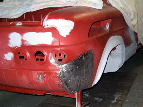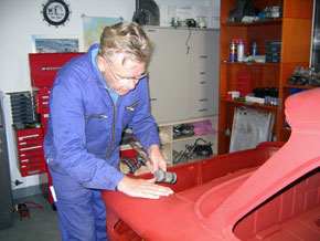 Der Lackierer tut sein Werk. Es werden Schicht für Schicht Spachtelmasse aufgetragen und wieder herunter geschliffen. Rundungen geformt und Übergänge angelegt. Viel Spachtelmasse wird verarbeitet, aber fast genau so viel wird auch wieder heruntergeschliffen. Es braucht seine Zeit.