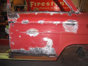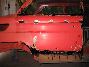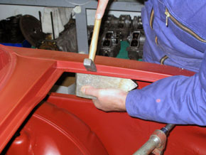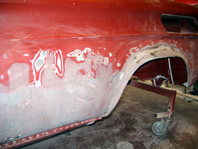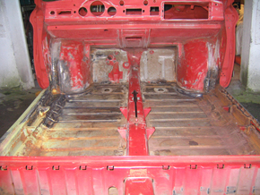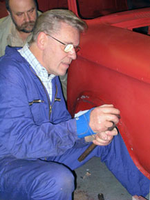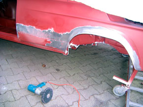 Jedes Teil an der Karosse wird mechanisch komplett vom Rost befreit und dann zusätzlich noch mit FERTAN behandelt. Übergänge von Arbeitsabschnitten werden stellenweise einige Zentimeter in bereits aufbereitete Blechbereiche hinein erneut verschliffen, um auch wirklich eine saubere Aufarbeitung zu erlangen.