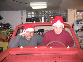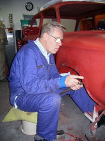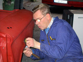 Ja, und wenn das dann mit Muskelkraft doch nicht gehen sollte, dann gibt es immer noch den Karosseriebau Otte in Gevelsberg. Hans-Peter Otte betreibt in Gevelsberg mit seinem Sohn Wolfgang und seiner Frau Cornelia einen Karosseriebetrieb. (Eigentlich ist jetzt Wolfgang der Chef, aber da geht eh alles Hand in Hand). Auf jeden Fall steht dort eine Richtbank für den Typ 67 in Kombination für Sportprinz und Spider.