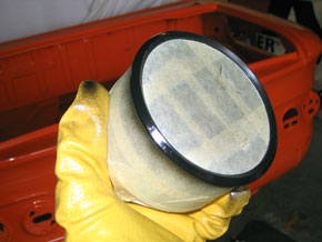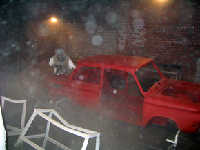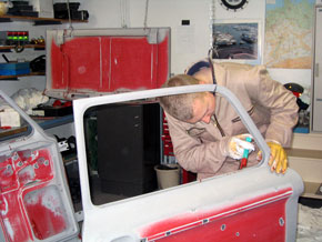 Letzte Reste von Rost, Spachtelmasse und Farbe werden aus den kleinen Stellen per Sandstrahlpistole vertrieben.