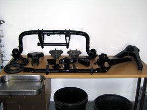Tja, und in der Zwischenzeit haben wir dann auch die Achsteile aufbereitet. Sie wurden gestrahlt, grundiert und schwarz gelackt. Alle Gummimetalllager werden noch getauscht.