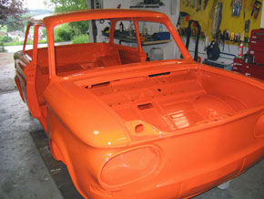 Tja, und am Samstag haben wir uns dann unsere Karosse in RAL 2004 angeschaut. Wir sind zufrieden. Einige wenige Silikoneinschlüsse müssen noch nachgebessert werden, am Mittwoch bekommt er dann noch Klarlack und am Mittwochabend soll er dann wieder bei uns in der Werkstatt stehen. Knapp drei Wochen zum Zusammenbauen - timing in Tüten.