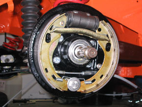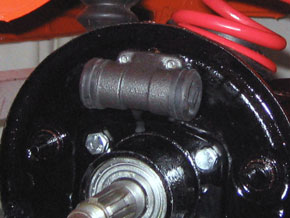 Die Radlager für vorne bekomme ich erst heute Nachmittag, darum fangen wir mit den hinteren Radlagern an. Die Lager wurden schon vor Tagen mittels eines Dornes heraus geschlagen. Ihren Lackanstrich hatten sie auch schon erhalten. Zunächst wurden die Lager, die einseitig verkapselt sind, von der offenen Seite her mit Fett gefüllt. Dann wurde das erste Lager mit dem alten Lager und einem kleinen Hammer angesetzt. Nun wurde das Innenpassstück ebenfalls mit Fett eingesetzt und das zweite Lager auch angesetzt. Mittels eines Passstückes, welches über die Bremstrommelaufnahme gestülpt wurde und den beiden alten Lagern, wurde das ganze mit dem Schraubstock verpresst. Querlenker, Bremsplatte und Lagereinheit wurden verschraubt. Man mag darüber denken wie man will, aber wir setzen alle Teile die verbaut werden, wegen Rost- und Korrosionsvorbeugung mit Hohlraumversiegelung ein. Der Gummistern ist auf seiner Außenseite plan verschraubt. Durch die hohe Belastung, der er im Fahrbetrieb ausgesetzt ist, kann er sich verdrehen und zerstört werden. Um dem vorzubeugen, haben wir seine Innenseite ebenfalls mit einer Metallplatte verschlossen. Die Bremszylinder sitzen auch schon an ihrem Platz. Rechts - links - fertig.