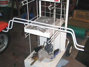 Es geht nach hinten. Der NSU wird hinten aufgebockt und das Rollgestell entfernt um die Auflageflächen des Motorträgers auch orangene Farbe zu verpassen. Anschleifen, Grundieren und zweimal Lacken, dass muss reichen.