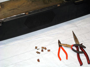 Heute war der Himmel an der Reihe. Die Zahnleisten waren neu und sollten an ihren Platz. Nur, wo waren die Löcher zum Verschrauben geblieben. Ursachenforschung. Es gab zwei Ausführungen, mit und ohne Zahnleiste. Unser NSU-Himmel hatte keine Zahnleiste und wurde geklebt. Nachdem die Querstangen in die richtigen Löcher eingehakt waren (es gibt davon je drei Löcher) und er gezogen und gezerrt war, wurden die Enden mit Pattex verklebt. Nach kurzem Ablüften des Klebers setzten wir dann unzählige Halteklammern an.