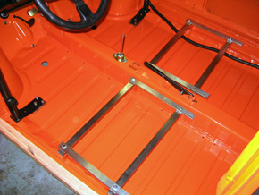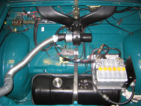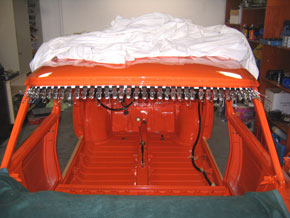 Die Post war noch nicht durch und die bestellten Teile somit noch nicht da. Also ging es an der Elektrik weiter. Letzte Kabel mussten noch verbunden und durchgemessen werden. Zwei Stunden lagen noch an und dann war es bis auf Kleinigkeiten geschafft. Der Handbremshebel und die Schaltstange bekamen einen neuen Lacküberzug. Das Scheibenwischergestänge bekam seinen Platz und das Stabiblech für das Windleitblech auch. Irgendwann kam dann auch die Post und mit ihr die erwarteten Teile. Die gelieferten Spurstangen kamen in ihre Löcher, Schalthebel und Handbremse wurden montiert und für die Züge vorbereitet. Irgendwie war es zehn Uhr abends geworden und man hatte immer noch kein Ende in Sicht. Nur irgendwann muss gut sein. Zur Vorbereitung für den nächsten Tag wurde dann aber noch der Tunnel mit Hohlraumversiegelung ausgespritzt.