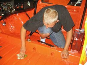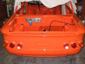 Wir blasen die gesamte Karosse mit Pressluft ab, Sauberkeit ist uns sehr wichtig. Nun waschen wir das Heck ausgiebig mit Silikonentferner ab. Dann wird es abgeblasen um Reste des Silikonentferners aus den Fugen und Kanten zu beseitigen und trockner dann alles noch einmal mit einem Lappen ab.