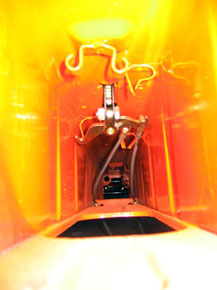 40 Stunden sind rum und das FERTAN muss wieder herunter. Zunächst wird der Boden wegen der hässlichen blauen Flecken wieder nass gemacht, die sonst auf dem Boden zurück bleiben. Wie schon bei dem Vorderwagen waschen wir mit einem kleinen Wasserstrahl und einem Scheuerschwamm das übrig gebliebene FERTAN von der Karosse ab, bis nur noch klares Wasser abfließt. Nun wird das überschüssige Wasser von der Karosse abgeblasen, mit einem Lappen abgetrocknet und die Überlappungen, Ecken und Ritzen mit einem Heißluftfön trocken geblasen.