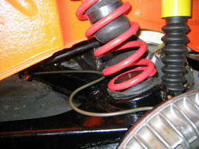 Nachdem alles verbaut ist, werden auch die Schrauben der Schräglenkeraufnahme am Fahrzeugboden fest angezogen. Die Schrauben, die durch die Gummimetalllager gehen sind noch lose, da sie erst festgezogen werden dürfen wenn das Fahrzeug fertig verbaut ist und auf eigener Achse steht. Warum?, die Lager schwingen nach oben und unten, und würden ohne Achsbelastung (Fahrzeuggewicht) zu einer Seite hin überbelastet werden. Das gilt für alle Gummimetalllager.