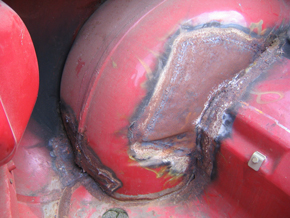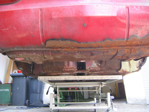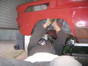 Viel Rost - Bedingt durch die angefangene Restauration und den nicht ausreichenden Oberflächenschutz. Fertigstellung von nicht beendeten Arbeiten. Beseitigung von fehlerhaften Schweißarbeiten. Reparatur des Heckschadens.