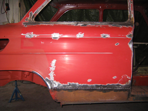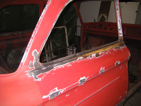 Nicht die besten Schweißarbeiten kamen zum Vorschein. In die Unterkanten der beiden hinteren Fenster waren schon einmal Bleche eingeschweißt worden. Auch unten zwischen der B-Säule und dem Radausschnitt waren neue Reparaturbleche eingeschweißt worden, mit einer Überlappung von gut drei Zentimetern. Die Türfalz unten hatte ebenfalls keine genaue Passung mehr weil auch dort Blechstücke eingesetzt worden waren. Was soll es, alles kommt neu. Hans Herrmann Walter aus Lemgo wird da schon wieder wie immer das Richtige auf Lager haben.