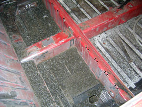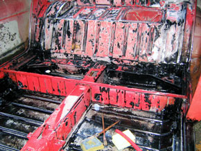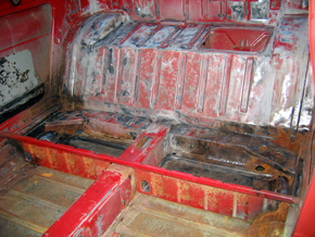 Von außen gibt es nichts Besonderes. Die Schürzenunterseite mit den Kotflügelecken weisen starken Oberflächenrost durch die Schweißarbeiten auf. Zunächst kommt für den groben Rost eine Topfbürste zum Einsatz. Zur weiteren Bearbeitung verwenden wir Grobreinigungsscheibe von 3M aus einem Drahtgeflecht. Diese Scheiben haben den entscheidenden Vorteil, dass sie Lack und Rost gnadenlos beseitigen, ohne die Metalloberfläche nennenswert abzutragen. Lackoberflächen werden herkömmlich mit Schmiergelpapier geschliffen. Rostnestern gehen wir mit einer kleinen Sandstrahlpistole zu Leibe, um den Rost auf den zugänglichen Stellen weitmöglichst zu beseitigen.