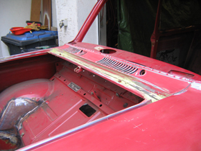 Das Heck, ölig und schmutzig war es damals hinterlassen worden. Gut, rostet nicht so schnell. Timo geht an die Arbeit. Mit einem trockenen Lappen wird der Motorraum vom Dreck befreit. Lose Farbe, und davon gibt es viel, blättert ab. Verstehen kann ich es nicht so richtig, weil, ist ja der Erstlack. Nach drei Stunden ist die Arbeit getan. Zum Vorschein kommt super gesundes Blech mit Erstgrundierung, natürlich auch Rost und so manche böse Überraschungen. Die rechte Seite ist hinten doch mehr gestaucht wie erwartet. Die Strebe am Heckblech ist verbeult. Die Kotflügelecken sind im unteren Bereich durch eine Patchwork Bratespachtelei verunstaltet, dazwischen ver- und durchgerostete Bleche. Nun gut, muss halt gemacht werden, und das ordentlich - aber später. Wochenende.